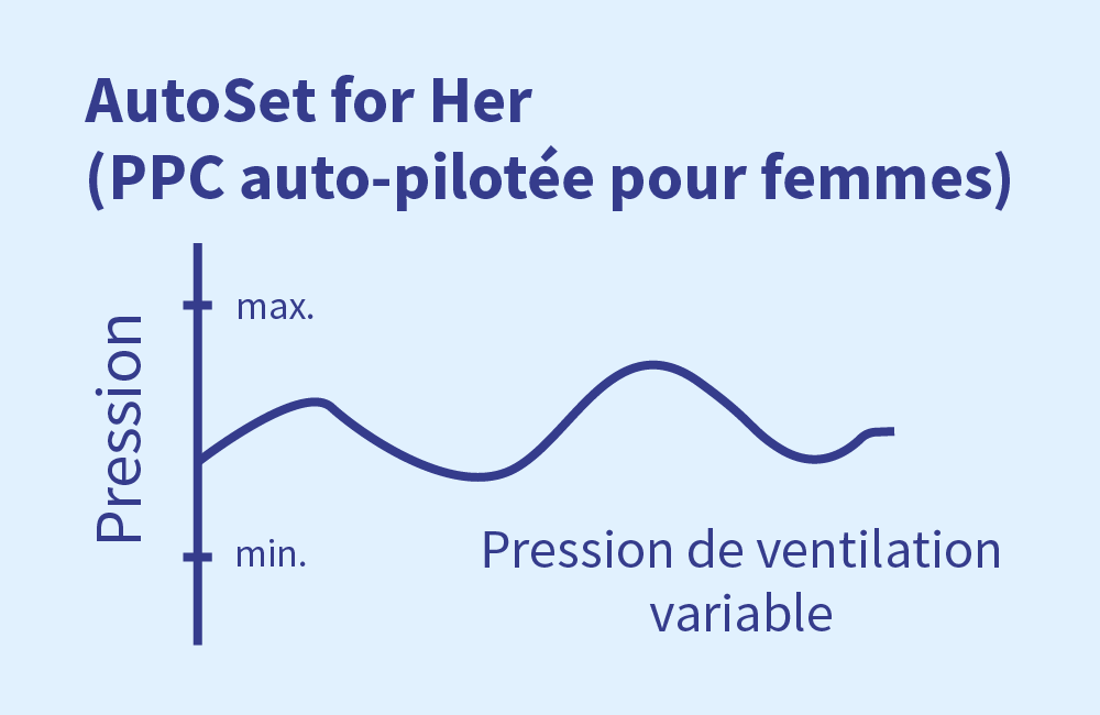 - TROIS MODES DE VENTILATION POUR PLUS DE FLEXIBILITÉ : AutoSet (PPC auto-pilotée, réglage automatique de la pression), AutoSet for Her (PPC auto-pilotée adaptée aux besoins spécifiques des femmes) et PPC classique (pression constante)