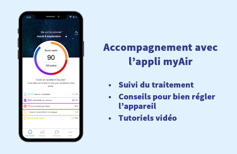 - MIEUX S’APPROPRIER SON TRAITEMENT : visualisez immédiatement les résultats du traitement et communiquez plus facilement avec votre médecin grâce à l’application myAir ; réglages simples grâce à l’assistant de traitement personnalisé